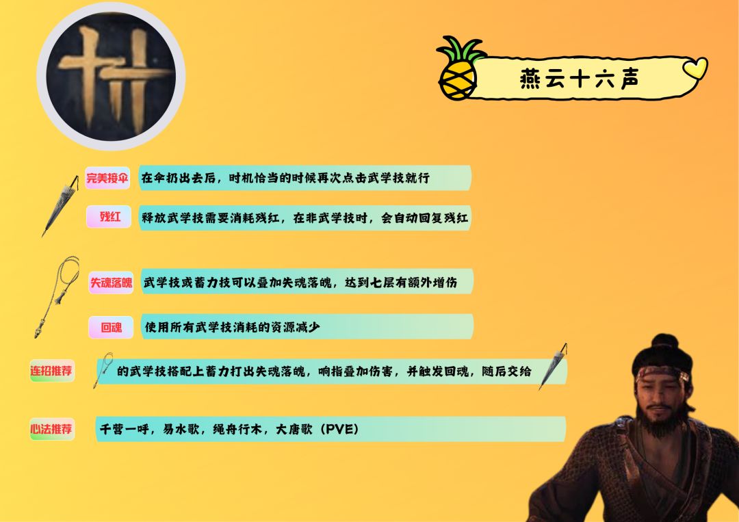如果你真的想转破竹尘玩一玩,我来安排一下伞镖的简单攻略,也算是省留版的教学,我是从新流派出来就一直玩到现在的,心法等级还算可以,大体的机制还是懂得,伞的武学技,扔出去伞再收回来,这里的第一个知识点,完美接伞可以增加伤害,所谓完美接伞就是在伞扔出去后,时机恰当的时候再次点击武学技就行,查看时机恰当的方式有两种,右下角技能图标发光或者伞刚好重合的动画,第二个知识点,释放伞的武学技需要消耗残红,没有残红就用不了技能,残红是通过自动回复的。绳镖的机制其实也比较简单,这把武器的蓄力技和别的武器不一样,点击按键开始蓄力,再次点击结束蓄力,然后开始攻击,简单来说,别的武器蓄力需要长按,而这把武器就是点按两次,第一个知识点,失魂落魄状态,当武学技或者蓄力技的绳镖每命中一次敌人叠加一层摄魂状态,叠加7次敌人进入失魂落魄,会获得5秒的5%增伤,并且这个时候使用特殊技打响指可以造成更高的伤害,想打出7次叠加,很简单,先使用武学技,武学技结束之后,会默认进入蓄力技的起点,等待蓄力几秒钟,点击蓄力技,这样武学技+蓄力就能打出7层效果了,当然并不只是为了5%的增伤,因为这个伤害持续时间太短了,重点是,失魂落魄状态还有一个额外buff,就是回魂,回魂可以降低所有武学的武学技的释放技能所需消耗的资源,这里你是不是想到了什么,没错的,伞的武学技释放技能需要消耗资源的,有了回魂,我们同样的资源,可以释放非常多的完美接伞了,这个伤害直接拉满了,当然你带上箫吟千浪那更好了,这就是破竹尘在pve的打法指引,如果你有不懂的,评论区讨论