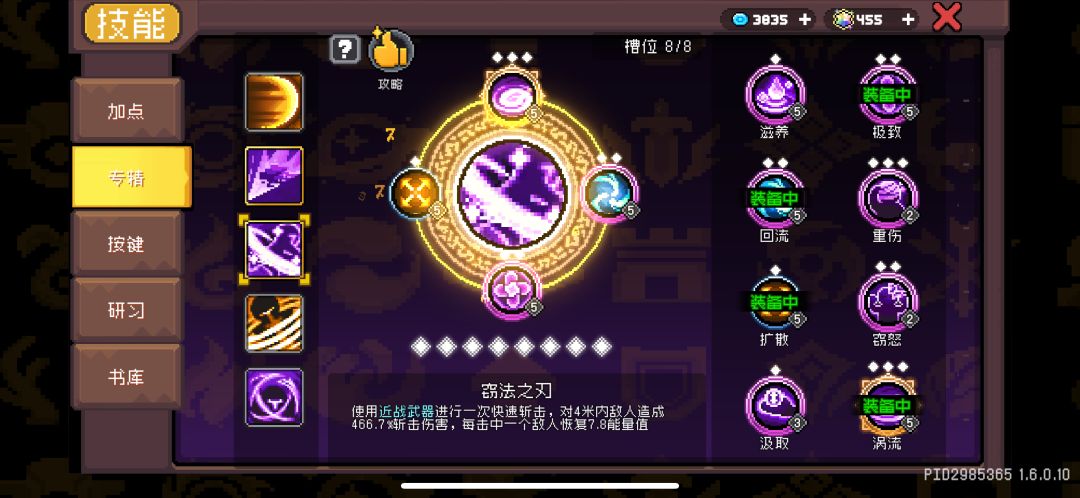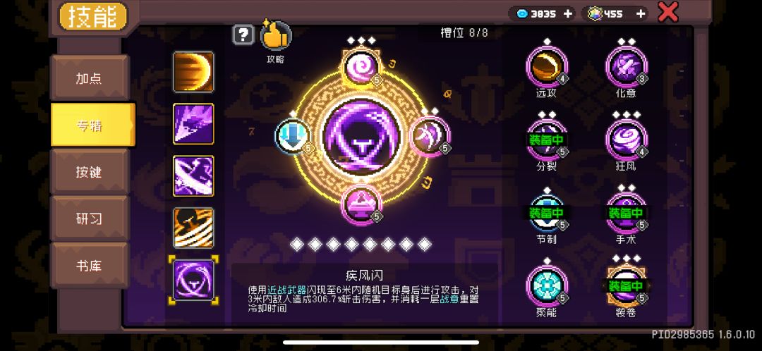 疾风闪:这个技能纯纯的挂件,伤害奇低,只需要点到8级把专精出满即可。“席卷“专精只有80%概率触发窃法,要通过”分裂“多一次攻击来提高窃法的触发几率;”手术“用来重置被动技能极意暴击时获取战意的0.5秒CD,用来保证战意一直维持在8-10层;同时”节制“专精用于保证蓝量不够的情况(没有的话大概率会出现空蓝,除非靠芯片回蓝)