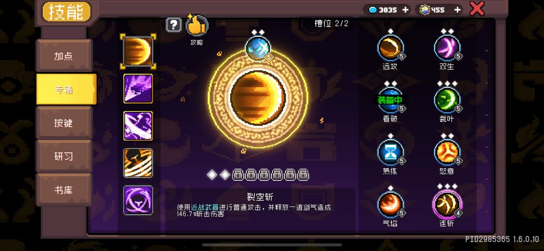 裂空斩:个人建议至少点到2级出格挡专精,高层塔非常需要这个效果配合幻影姿态达成角色无敌,不然被摸一下基本就倒了。