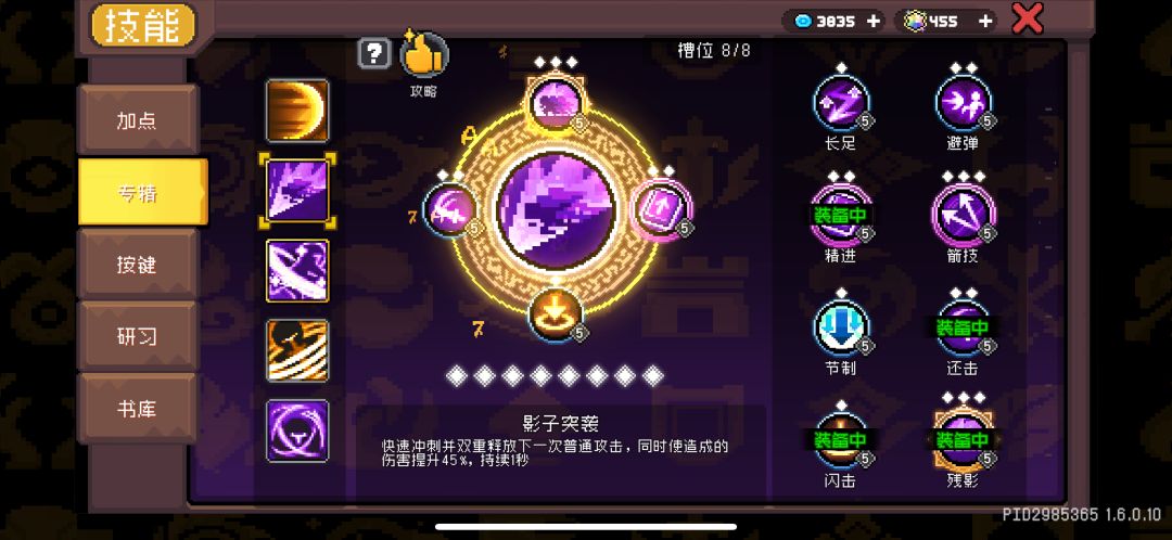 为了攻击技能多触发1次,需要点至5级,装上“残影”和“精进”专精