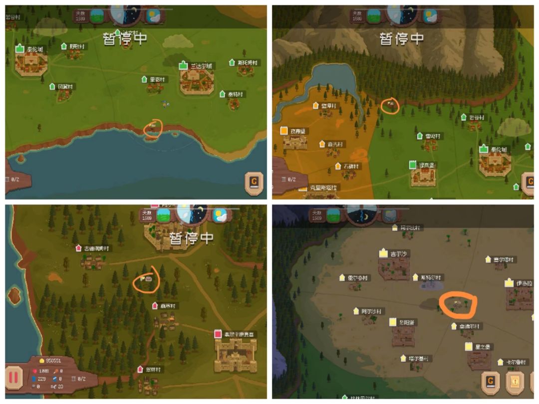 赫尔加:下边黄绿交界,蓝谭村和雷鸣村做一条直线的上边顶点,强盗75人士气高,管理训练拉满带50风暴骑无伤了