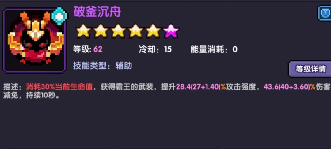 注意重点,使用回复技能提供伤害加成,如果生命值在50%以下时额外获得伤害加成,由此我们可以得知,我们需要保持残血并且持续使用回复技能