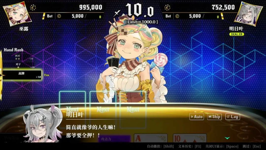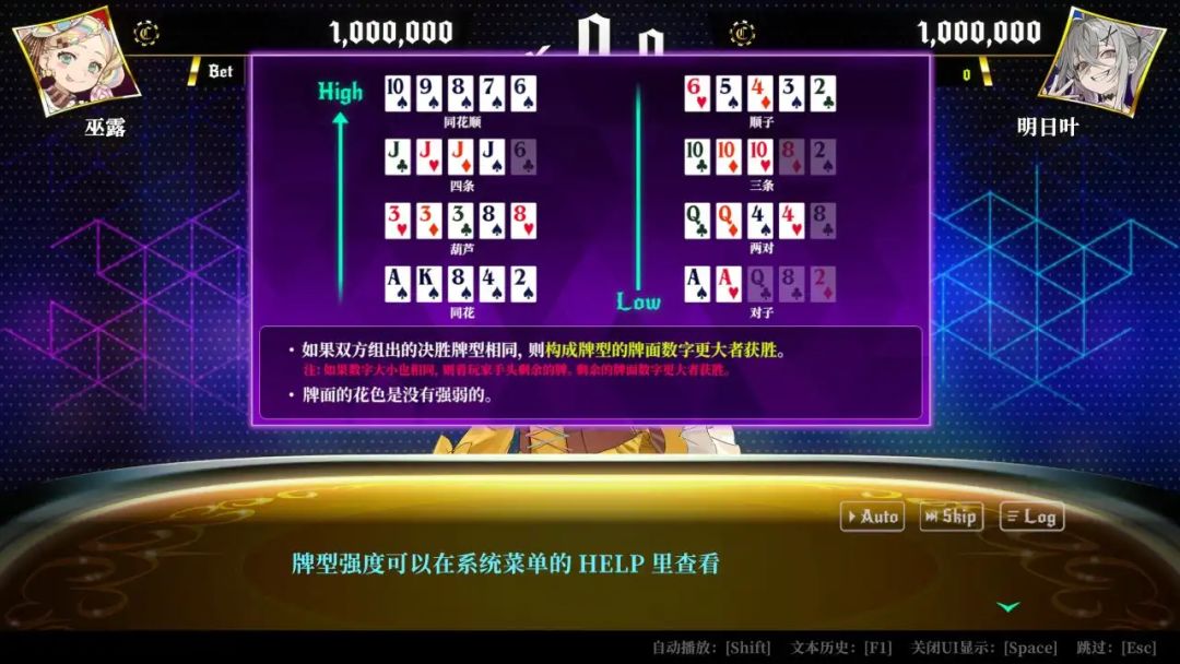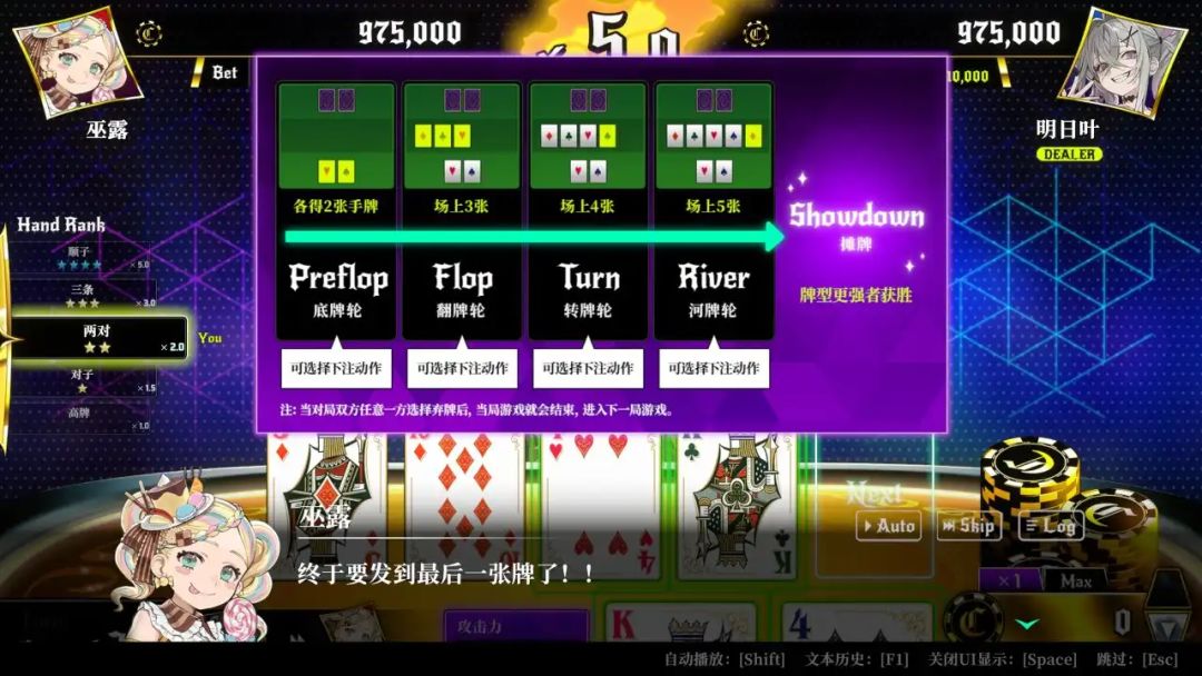介绍完游戏的主要内容,大家可以发现,这就是一款德州扑克+视觉小说的玩法,那么德州扑克相信不少玩家没有接触过,所以在这里我也为各位简单介绍一下德州扑克的玩法。