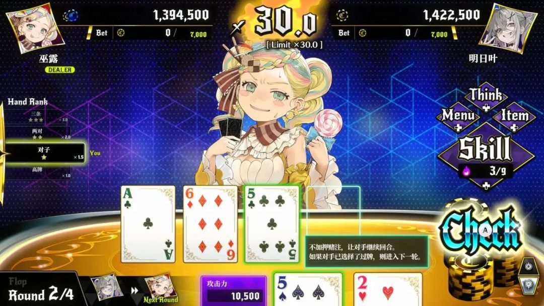 而游戏中本意是让千术更加丰富的技能系统,却基本上固定了两个技能:一个挑衅不让对手弃牌,一个天运确定最后一张牌。