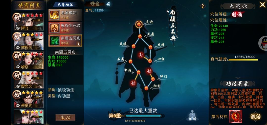 11.功法怎么得到:开始只有师父送的一本,阿飞专用的。其他功法要开启炼狱征伐后,打副本爆,慢慢弄。功法对队伍的提升很大。
