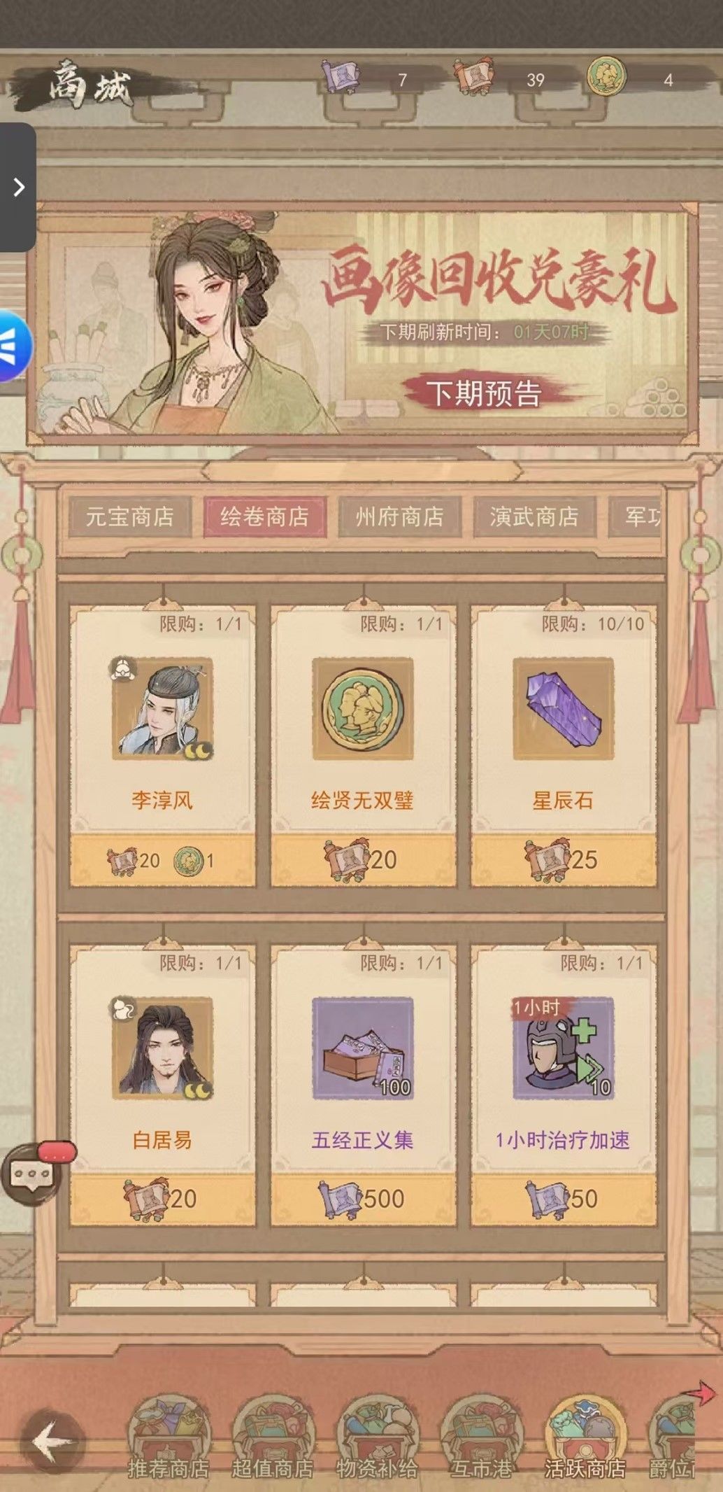 僚属升星除了在特定星级需要本体卡以外,其他星级的升星需要一定数量同势力的3星/6星画像,我们一般把蓝色和紫色画像作为升星材料,用来给橙色僚属升星,不用的橙色僚属不建议用来给僚属升星,因为当我们拥有一个12星僚属以后会解锁绘卷商店,可以通过回收画像获得绘贤金卷和银卷兑换道具和僚属,不用的橙卡用在绘卷商店的性价比更高