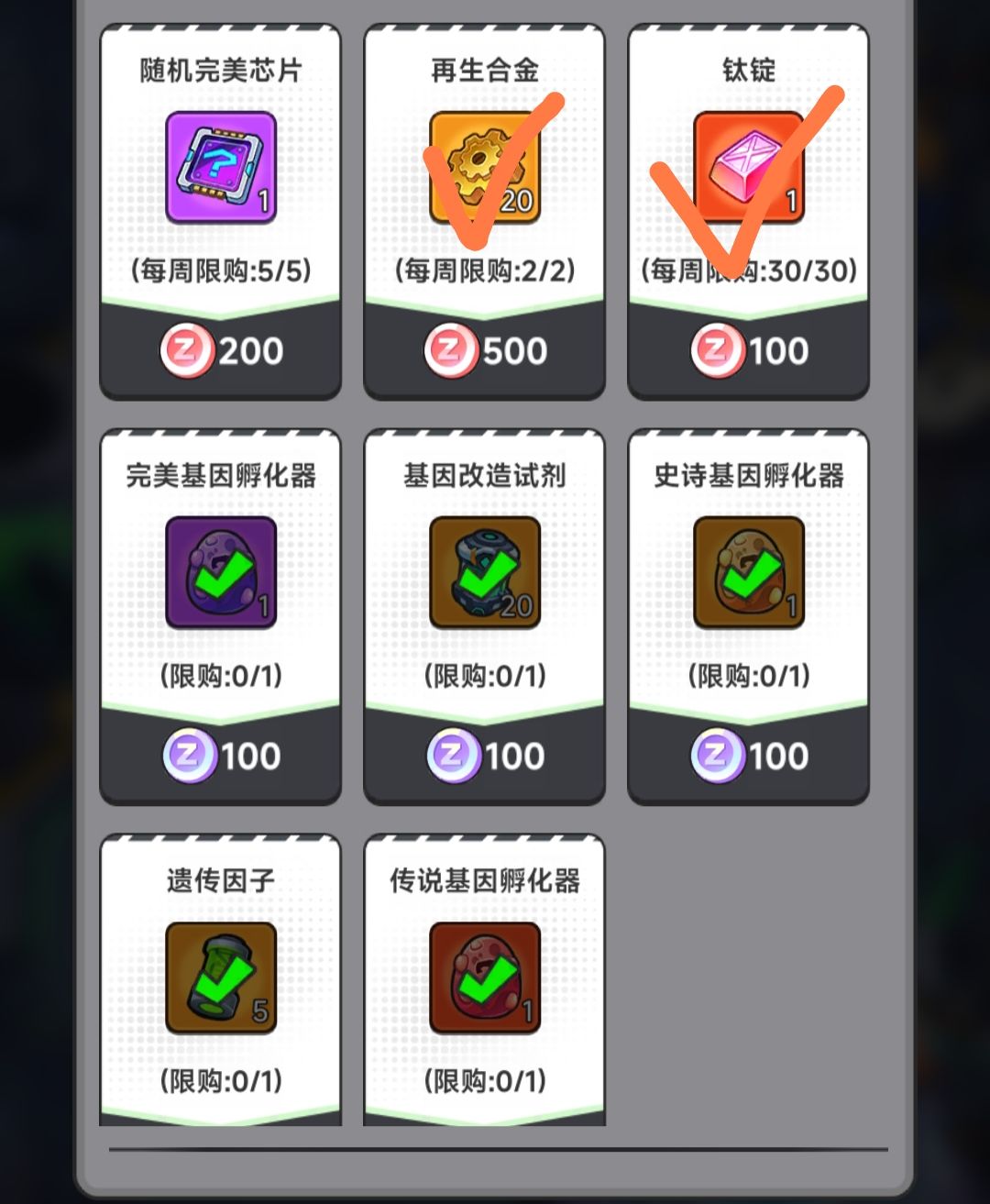 (2)高级基因代码,优先级如下:高级研发手册>钛锭>再生合金,其余物品不考虑。其中钛锭获取900个后,不再兑换。