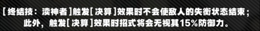 触发【决算】效果失衡状态不会结束,输出手法改变,且无视15%防御力,提高爆发伤害