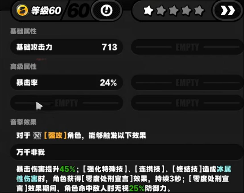 音擎推荐:优先推荐专属音擎【千面日陨】:对[强攻]角色,能触发以下效果:万千非我