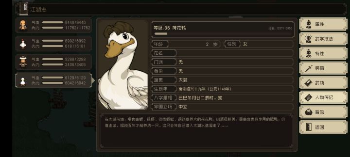 抓就是一级,这个真的很爽,超高天赋,通过重新战斗可以刷荷花鸭属性,建议悟性小于等于5,道德25。