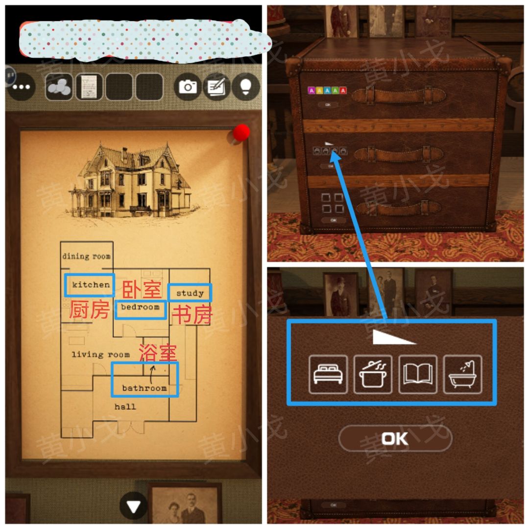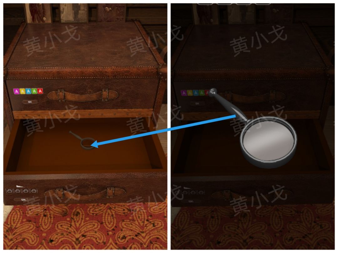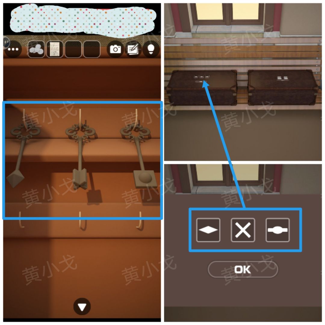 9.点击庄园大门左侧行李箱上的密码锁,根据[门厅]场景锁孔形状线索,调整密码锁