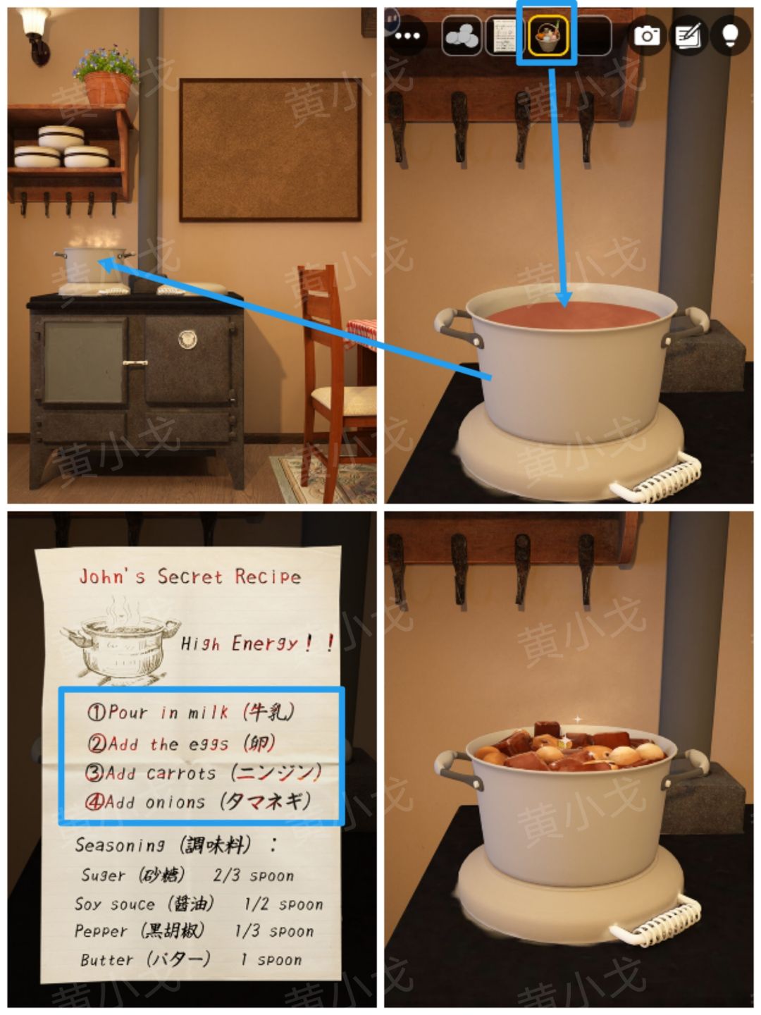 27.点击锅,根据【食谱】上的线索,按顺序放入食品,获得【煮好的菜】