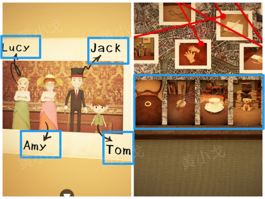 ②照片上物品特征对应:Amy的耳环、Jack的雪茄、Lucy的咖啡、Tom的玩具熊