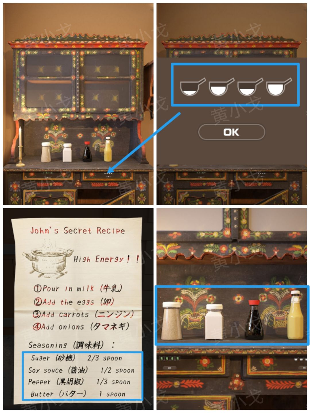 4.点击右侧抽屉上的密码锁,根据调料瓶位置顺序,结合【食谱】上的线索,调整密码锁