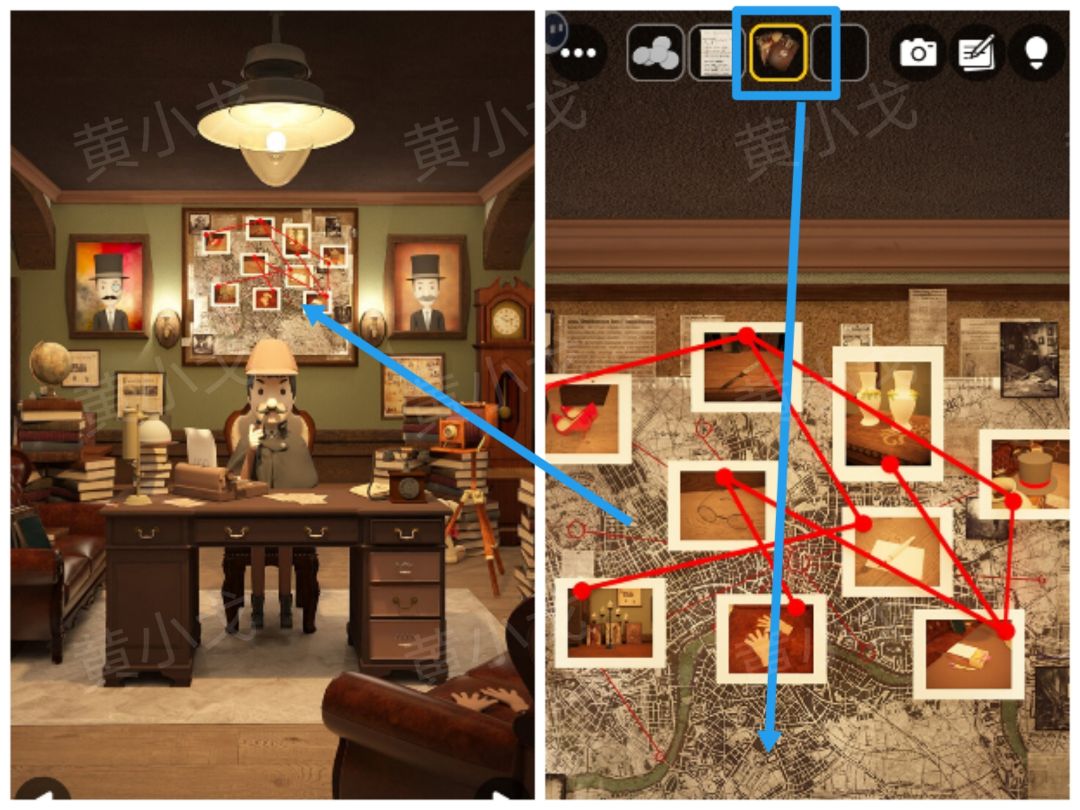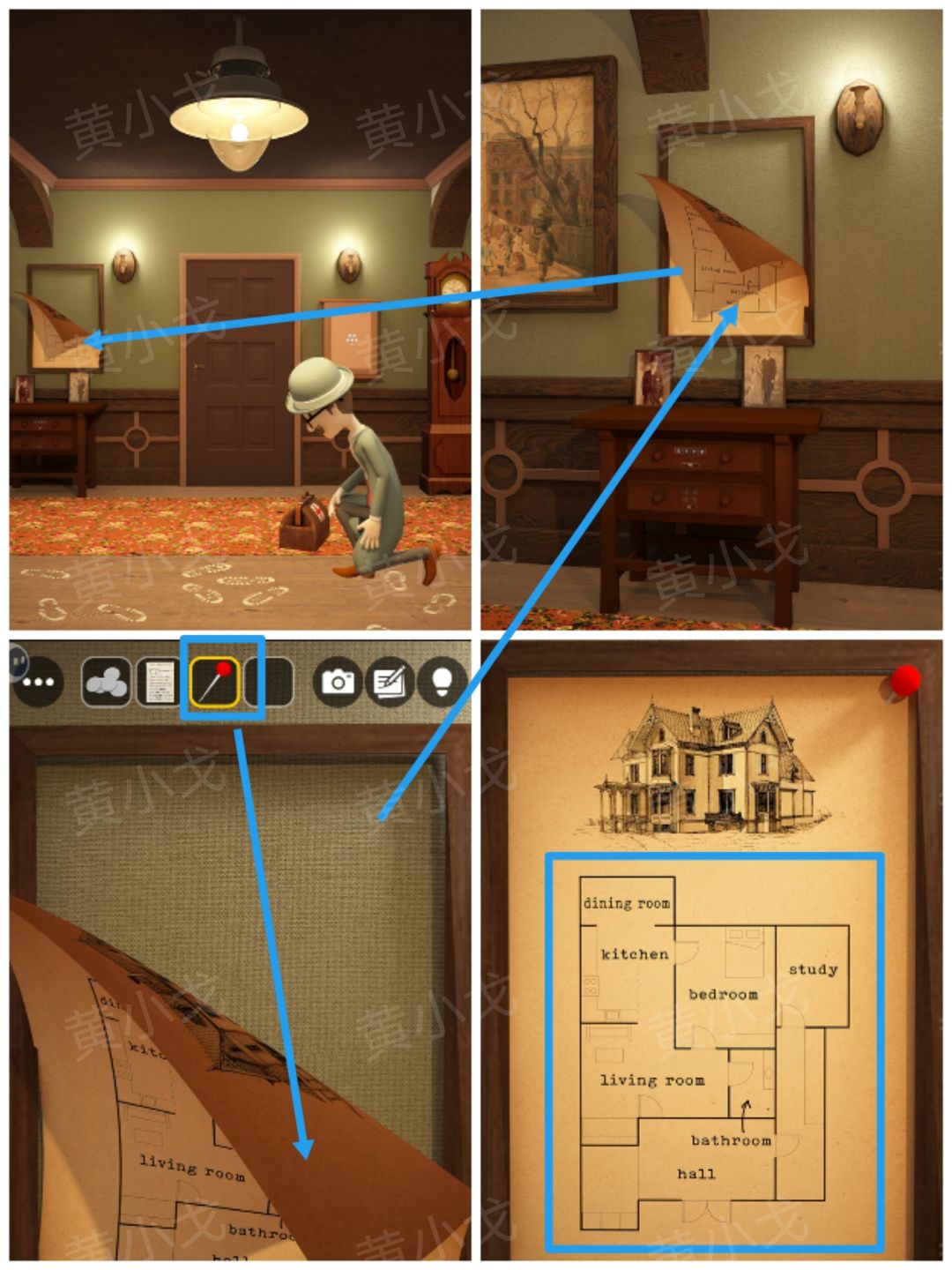8.点击墙上的地图,使用【固定针】,获得线索