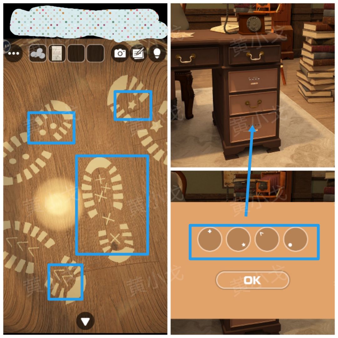 18.点击书桌第三个抽屉上的密码锁,根据[门厅]脚印照片,调整密码锁