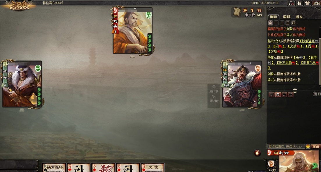 梁兴开南蛮+杀没能打出伤害,轮次结束时赵云【镇胆】摸牌。谋华雄的回合【搏决】+南蛮带走梁兴,刘备投降,我方取得胜利。
