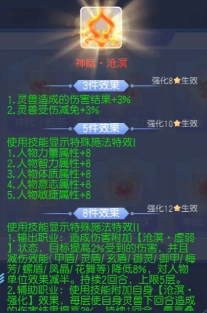 八件套:输出职业造成伤害附加【沧溟·虚弱状态】,目标受到伤害提高2%,减伤效能降低8%,对人物单位效果减半,持续2回合,上限五层。