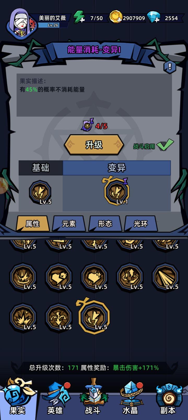 5-10噩梦和精英都恶心的要命,必须第一次变蛋用爆炸输出打爆掉。主线我是用觉醒的宙斯打爆的,但发现精英打不过,也可能运气不好没得到极品果实组合。我是用女王过的,关键是觉醒一个变异果实如图所示(这个果实感觉和说明不一样,没有45%这么高几率触发,但是一旦触发经常能接连触发好几次);这个运气好能不耗蓝无限连直接打爆蛋蛋。前提女王觉醒,再带上链接、元素果实最好的是变异雷果实、各种分裂、穿透、弹射、双重施法等,总之就是各种增伤杠杆,外加各种伤害加强光环,总之越多越好。最好再带个英雄圣女加深伤害。