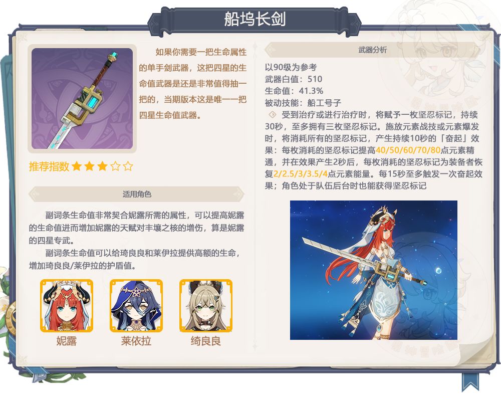 3、船坞长剑抽取建议:如果你需要一把生命属性的单手剑武器,这把四星的生命值武器是还是非常值得抽一把的,全游唯二的生命值武器之一,另一把是限定五星的板砖,可见其含金量