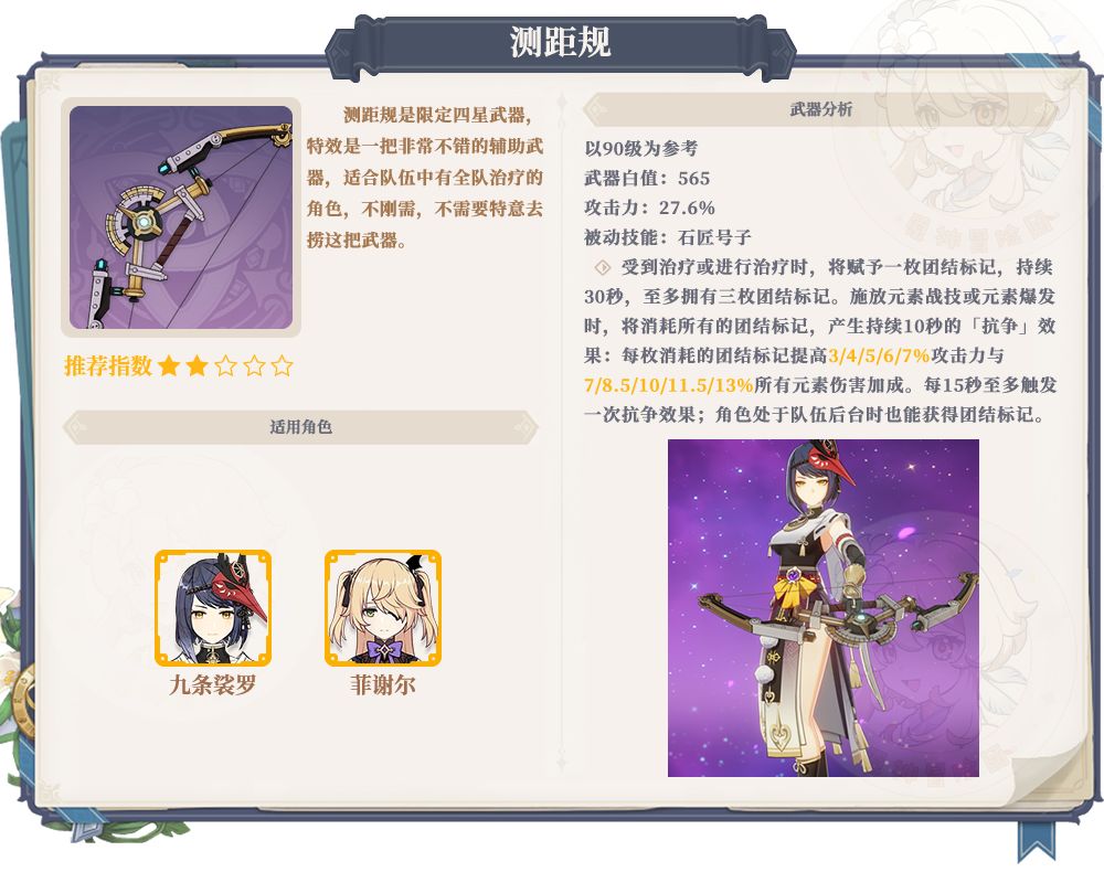 6、测距规抽取建议:测距规是一把非常不错的辅助武器,能给前台提供不错的增益,不过触发条件有些苛刻,弓箭辅助几乎都没有自带治疗,需要一个绑定全队治疗角色,泛用性比较差,属于抽到有用但不建议特地抽的那一类