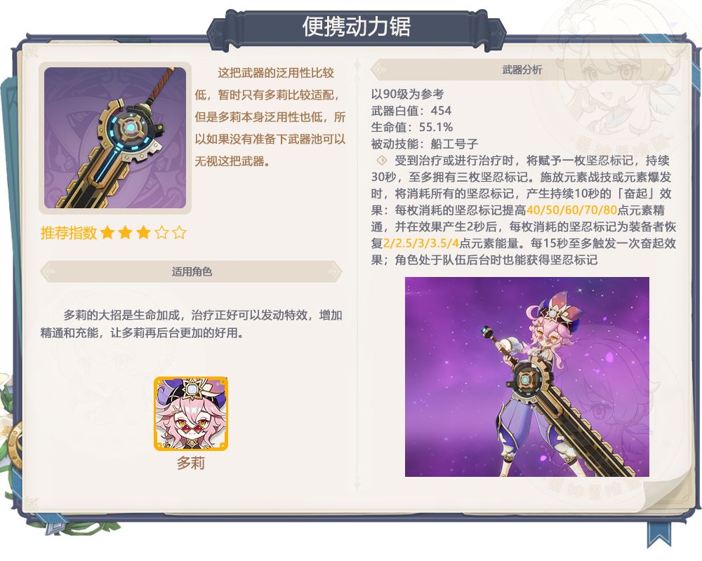 5、便携动力锯抽取建议:这把武器的泛用性比较低,暂时只有多莉比较适配,但是多莉本身泛用性也低,所以如果没有准备下武器池可以无视这把武器,抽到了也大概率只是收藏