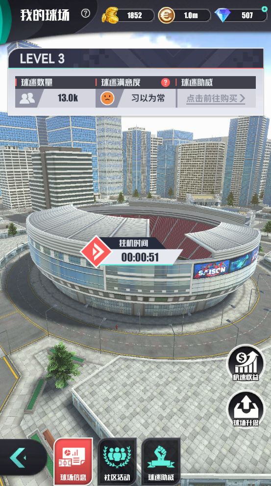 每隔一段时间即可前往球场领取你的挂机收益!挂机收益也是营运资金的主要来源之一哦~球迷数量越多,收益也越多!每天都有一次免费快速收益机会哦!