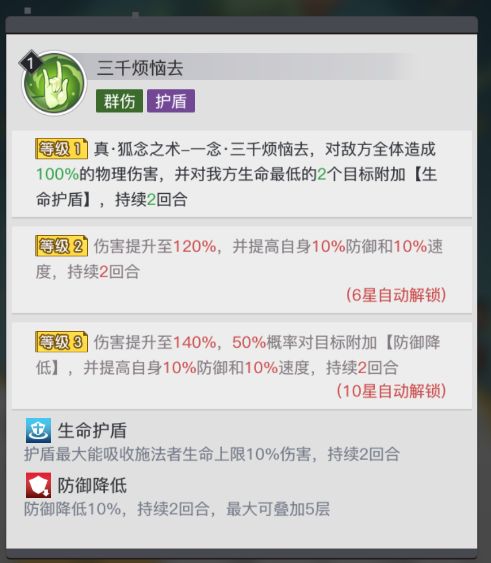 涂山容容的怒气技【三千烦恼去】能够对敌方全体造成高额的物理伤害,一定概率降低目标防御,提高自身防御和速度,并对我方生命最低的2个目标附加【生命护盾】。从技能描述就可以看出,这是一个非常全面的角色技能,对敌方造成伤害、降低敌方防御、提升己身数值加上为队友附加护盾,有效地保护了我方的生存能力并削弱敌方状态。