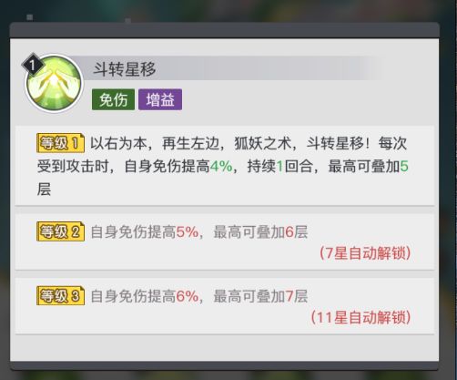 容容的技能【斗转星移】能够在她每次受到攻击时提高6%自身免伤,最高可叠加7层。这就意味着容容最高能为自己提升42%的免伤值,极大提高了自身坦度。