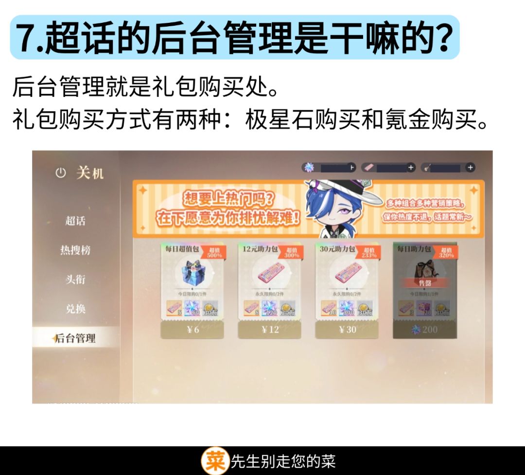 后台管理就是礼包购买处。礼包购买方式有两种:极星石购买和氪金购买。