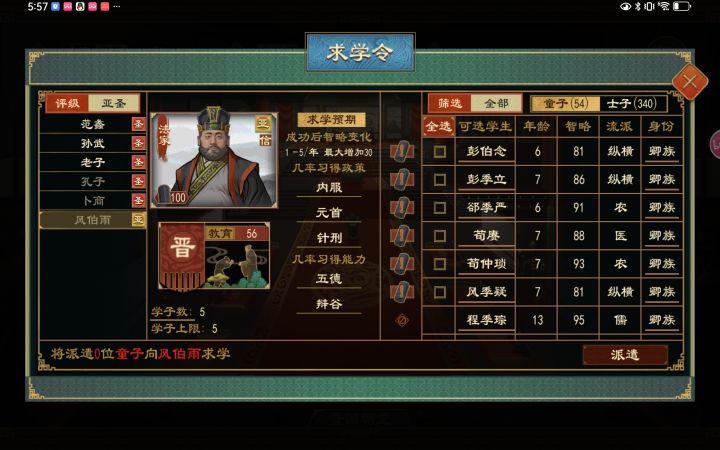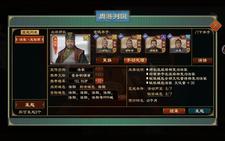 1.首先周游列国的师长必须要有特殊buff,xx大师或者xx传人,以法家为例。如果要获得法家的特殊buff,就让一个高智略的人多去施政,比如可以通过不停的改建军队去刷特殊buff获得法政大师,其他流派去看其他攻略。