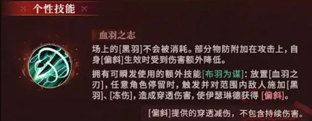 战术多变的突袭者指挥官,擅长在战场中布局[血羽之刃,触发后对敌造成范围穿透伤害和冻伤。她还能为己方施加[偏斜],提供高额的减伤和穿透减伤,但受到单次非持续伤害后会失效。根据自身携带的被动技,她能灵活选择为队友提供额外的护盾、再移动,或对大范围敌人追加伤害。