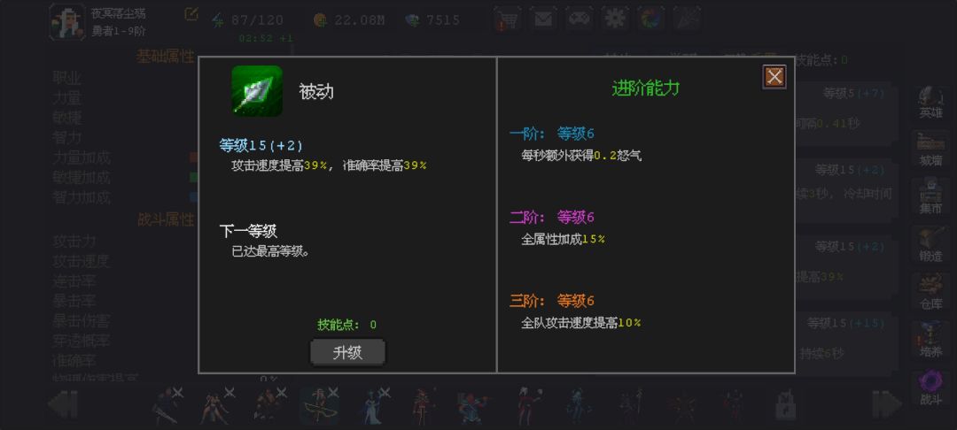 绝招这里进阶我们都加满,一转+4符文+4项链+2戒指+5直接搞到了30,全队攻速都达到了97.5%!!优先二阶回怒。在一阶准确率,三阶的穿透不知道火法这种弹道攻击吃不吃,所以留着其他辅助加满在来加这个三阶!这里加点顺序是15+2+1+3