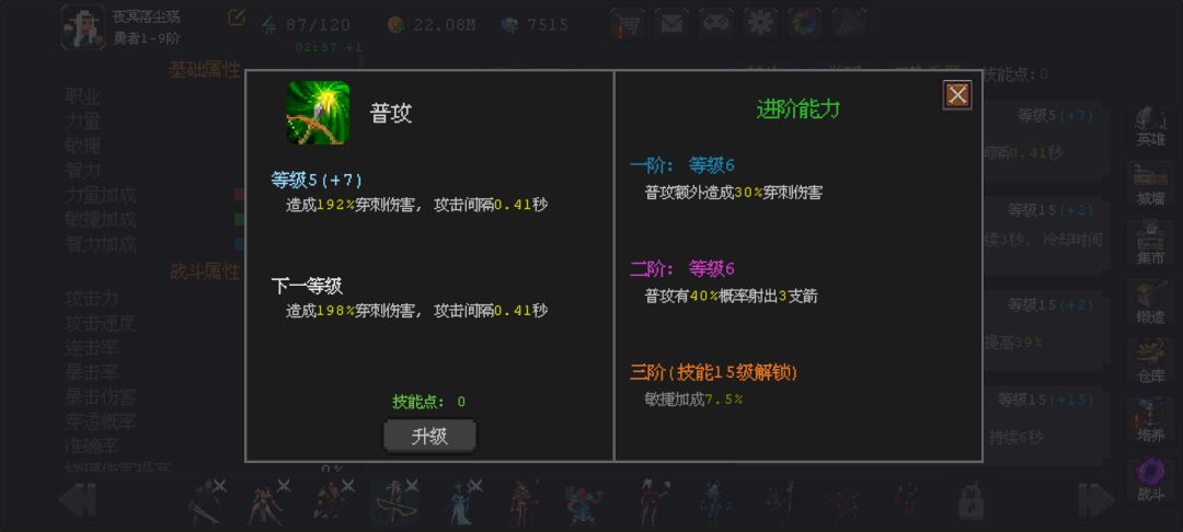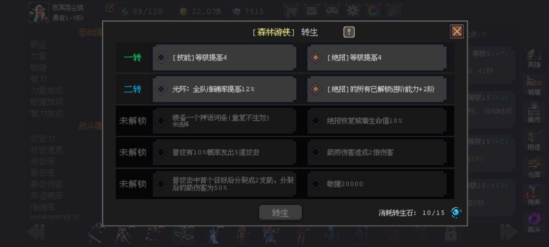 游侠如果有能力转生的话推荐一转绝招+4,二转绝招进阶+2,三转城墙回复生命,四转普攻概率5道攻击,五转普攻分裂箭。就是22211加点!!