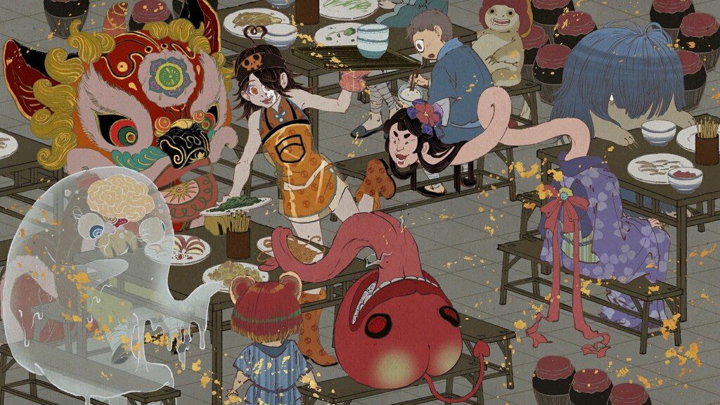 九尾狐用尾巴圈出的温暖结界里,汤生终于不用再假装吞咽人类的食物;那些曾让他恐惧的妖怪们,此刻正在分食他亲手做的章鱼烧,油渍在浮世绘卷轴上晕开暖色的光斑。