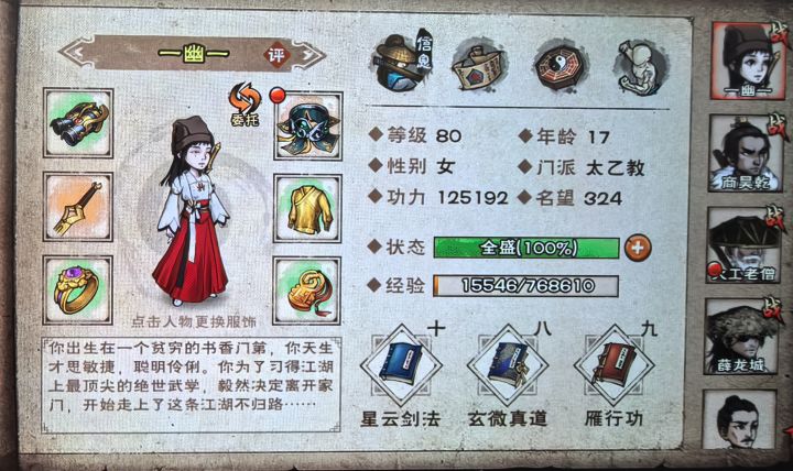 女剑主,拘魂,速判 天刀->苍狼->太乙,关键秘籍已拿。目前太乙镇派内练到8重了,主要小星云输出。 下一步是镇派内继续升满吗?还是直接去极乐学道心? 或者中间去冷月拿些秘籍先?