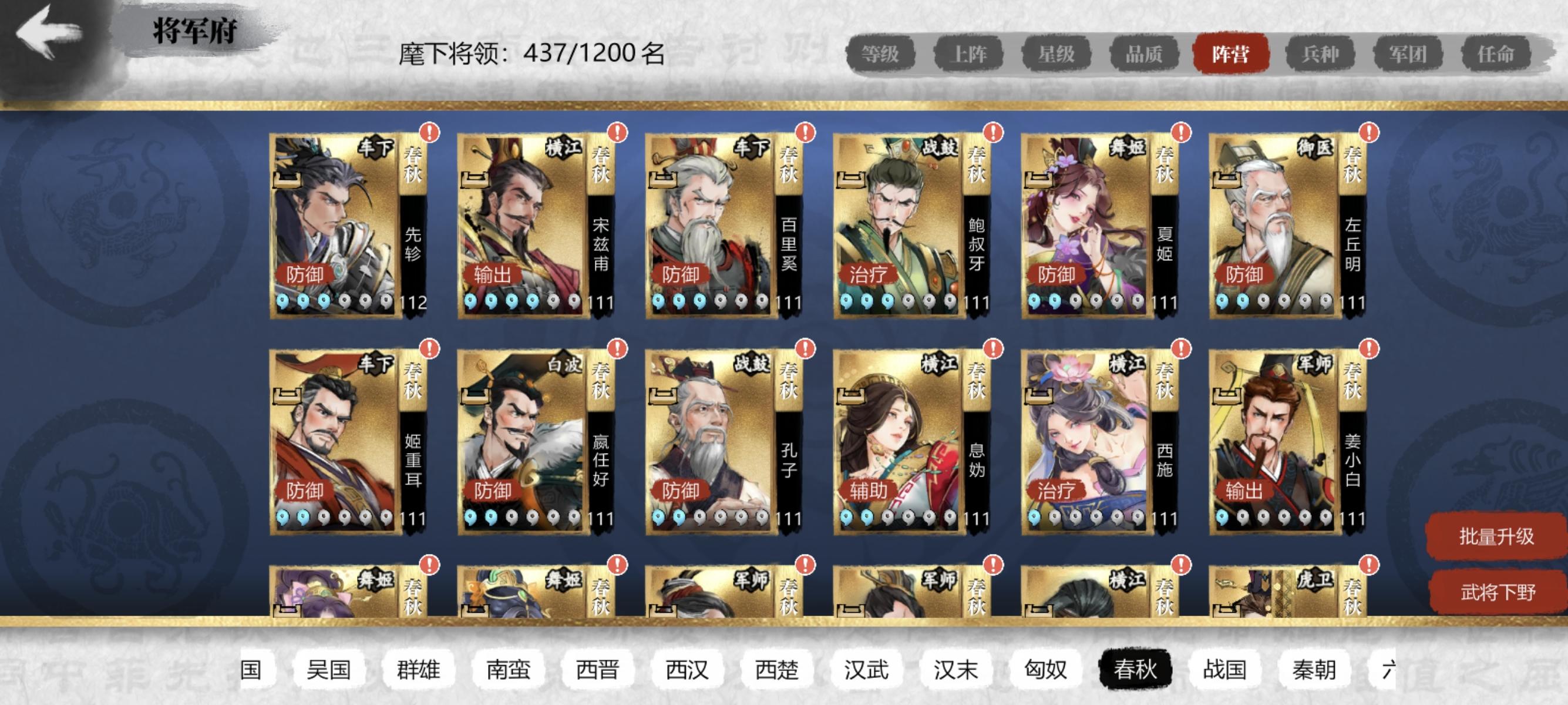 21年到22年期间陆陆续续玩了大半年吧,突然下回来看看,新出了好多朝代,没截图阵营全都是空的,不知道从哪个池子开始抽好