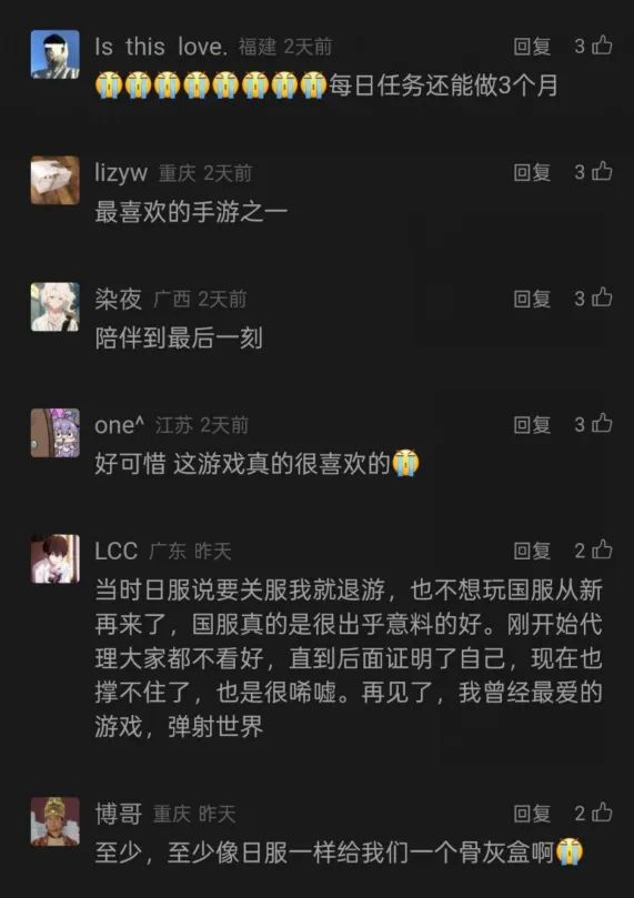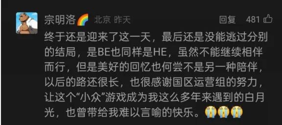 “终于还是迎来了这一天,最后还是没能逃过分别的结局,感谢国区运营组的努力,让这个‘小众’游戏成为我这么多年来遇到的白月光,也曾带给我难以言喻的快乐。”
