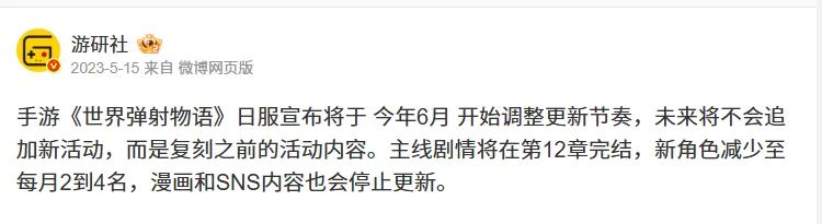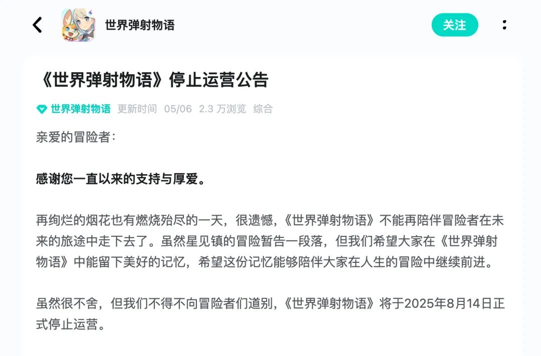 2023年5月 《世界弹射物语》 贴出一张病危通知书,宣布主线完结,不再新增剧情活动,社区连载的配套小漫画也一并停更。