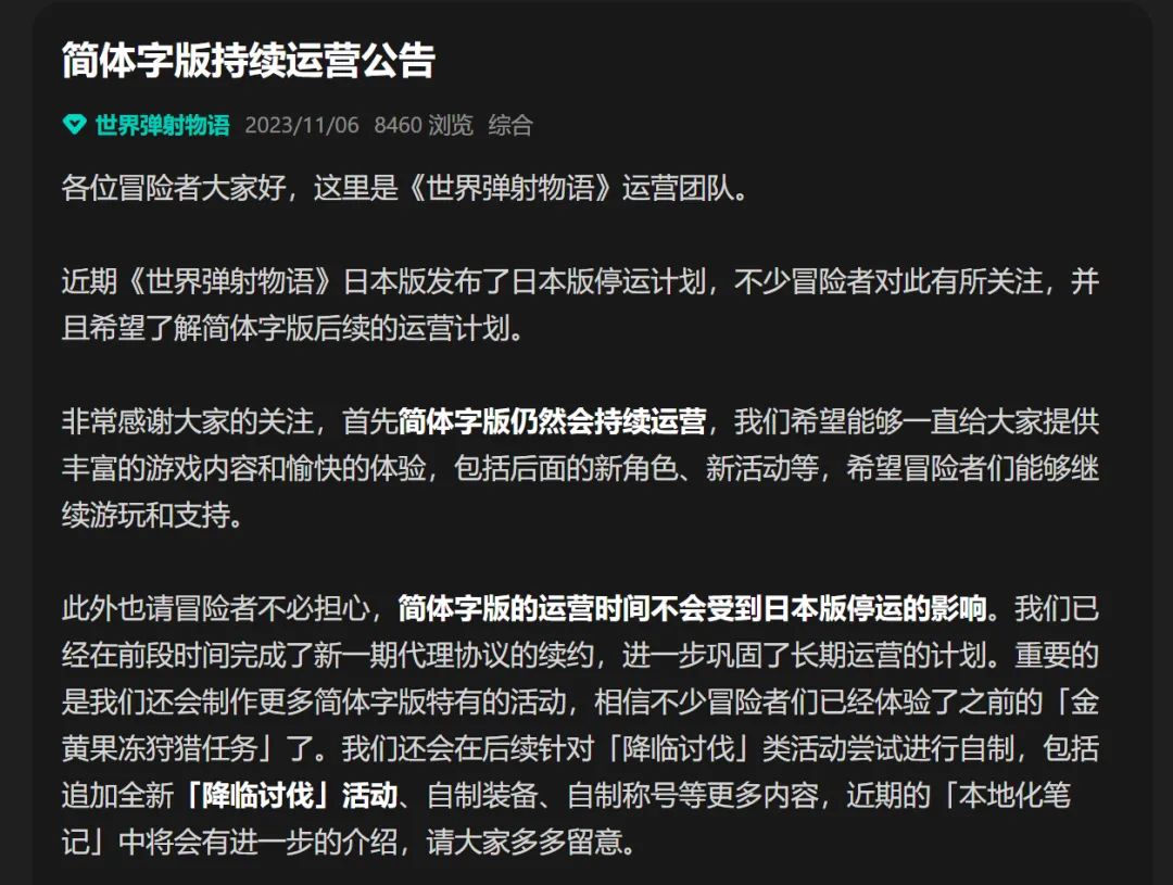 半年之后,2023年11月,日服发布停运公告——24年2月停服,国际服紧随其后,23年12月宣布即将停运,国服成为最后的独苗。