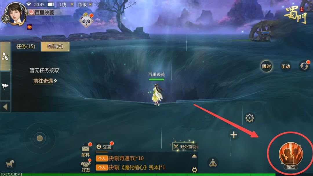 ✅达成细节:1.前往天化村地图的墨池处(下方红圈内),点击右下“摇签”技能进行摇签,即可触发奇遇任务;