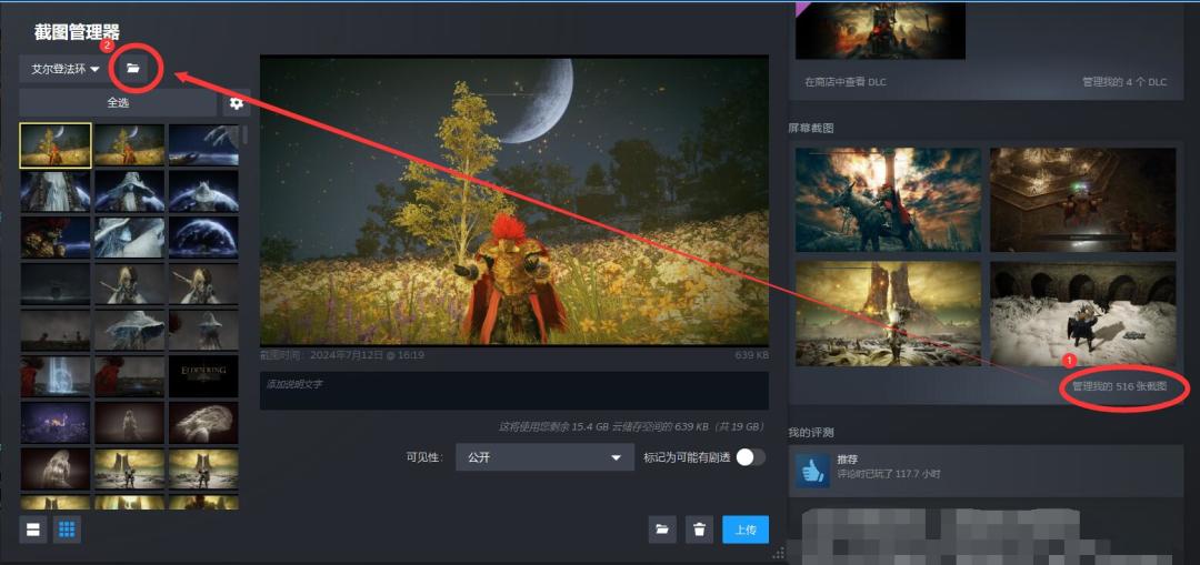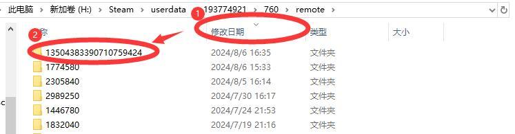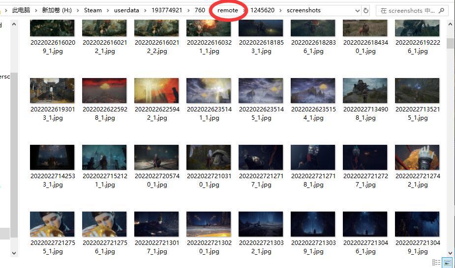 6.随便找一个已经截过图的游戏→管理我的截图→显示本地磁盘中的截图→返回到路径中的remote文件夹→按修改日期排序→找到刚刚截图文件夹(应为约20个字符的一长串数字)→将该文件夹重新命名为1774580
