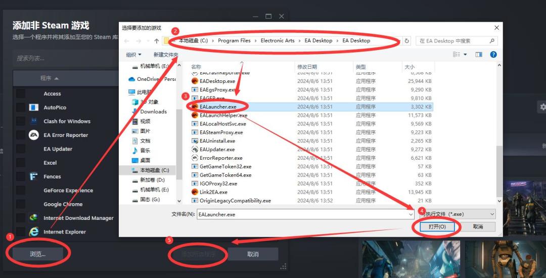 2.找到Steam客户端左下角的添加游戏→添加非Steam游戏选择EALauncher.exe 如果找不到就点“浏览”从上面提到的路径中EA Desktop文件夹里的EALauncher.exe→添加所选程序(显示为App Recovery)