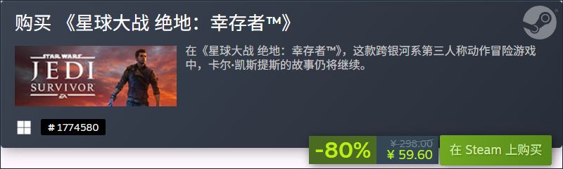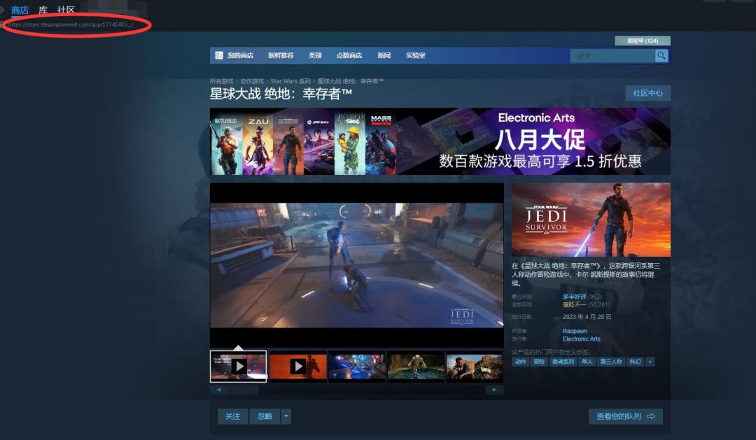 5.回到《星球大战 绝地:幸存者》的商店页面,看游戏的地址栏, 即:https://store.steampowered.com/app/1774580/_/