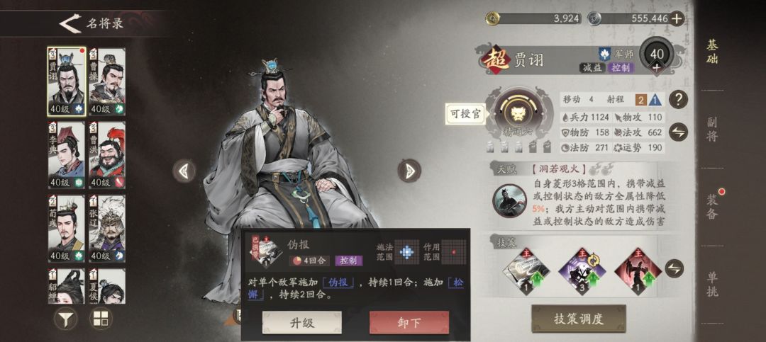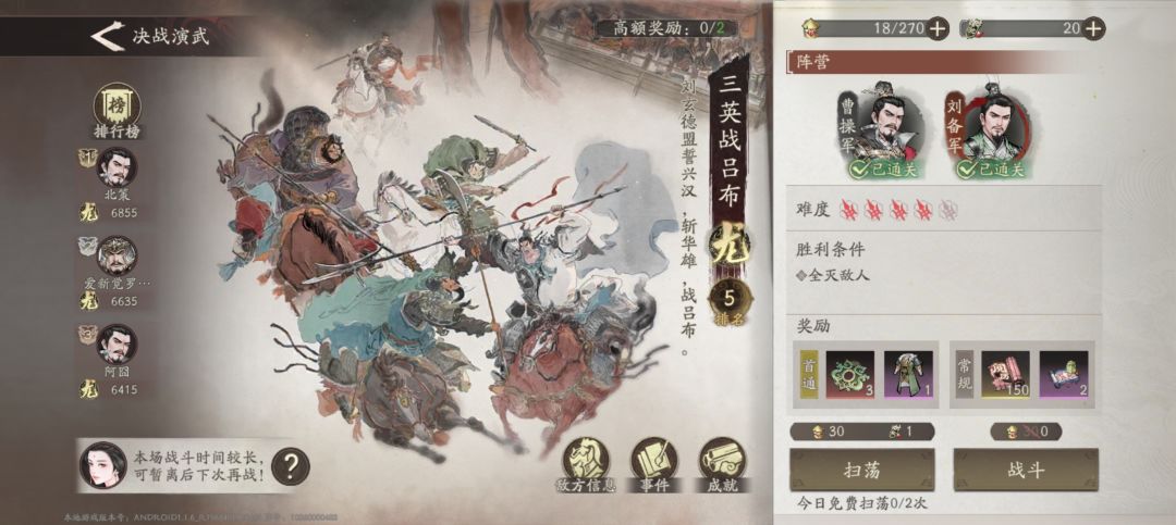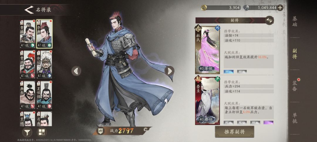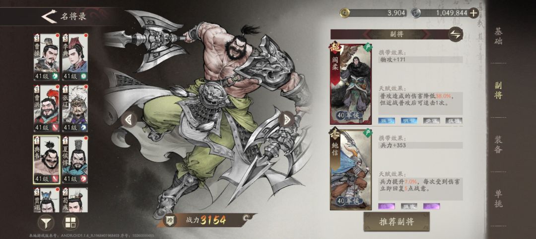 阵容搭配,一辅助+5输出(有两个是前排肉盾型)我用的是曹操+李典+张辽+夏侯惇+典韦+曹洪(荀彧和贾诩备用,后面会讲这两个的作用)