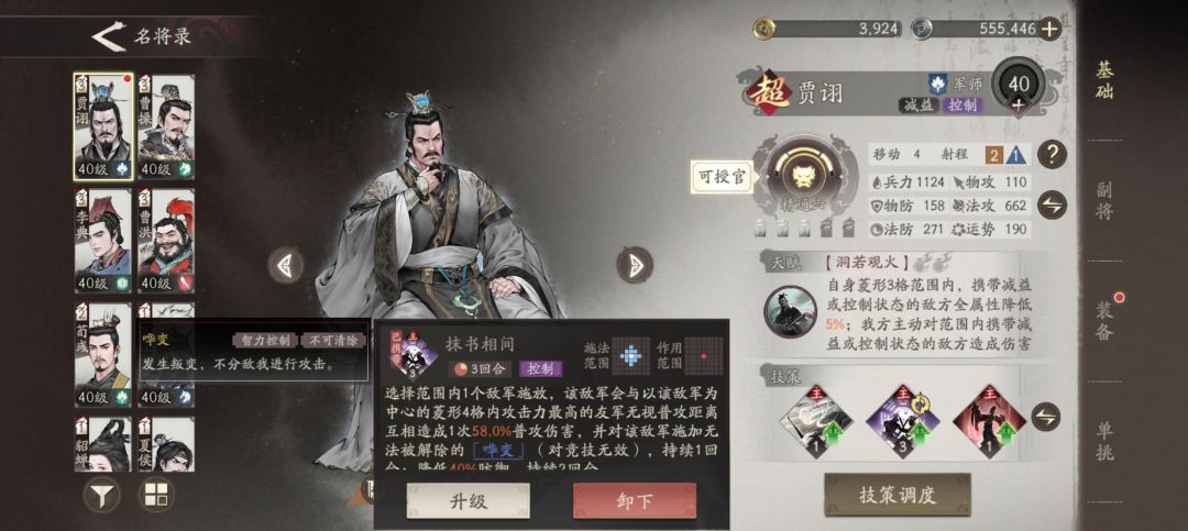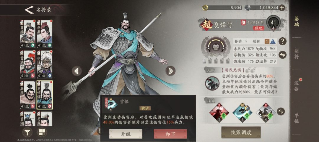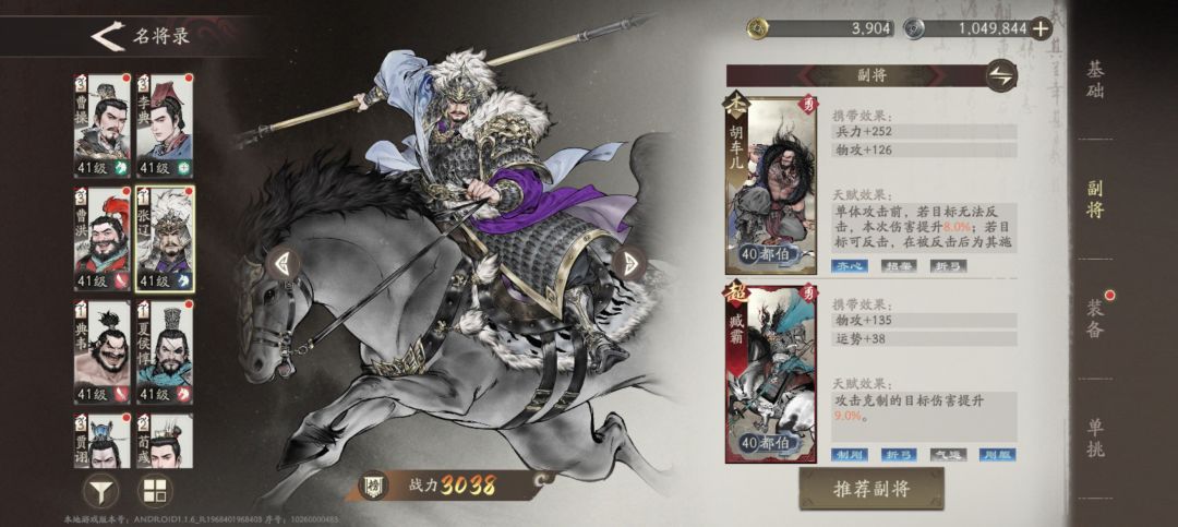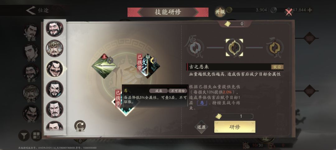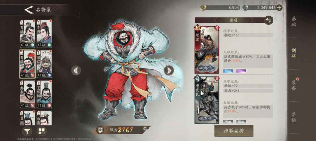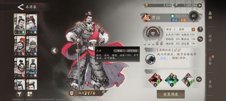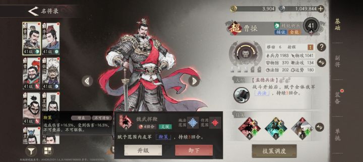 1、曹操,因为是魏国主线,所以视角就是跟随曹老板,从宦官当权,到曹操行刺董卓,后面自己创业,目前是打到了官渡之战,曹操很多副本是必上的,所以需要养一下,他的定位的是辅助,核心就是加buff,开局自带兵法加伤害加防御,以及技能魏武挥鞭,减伤+增伤16.5%,还是很给力的,副将的话我主要是堆他的兵力,因为很多主线的要求是曹操不能死,所以保他的命很重要