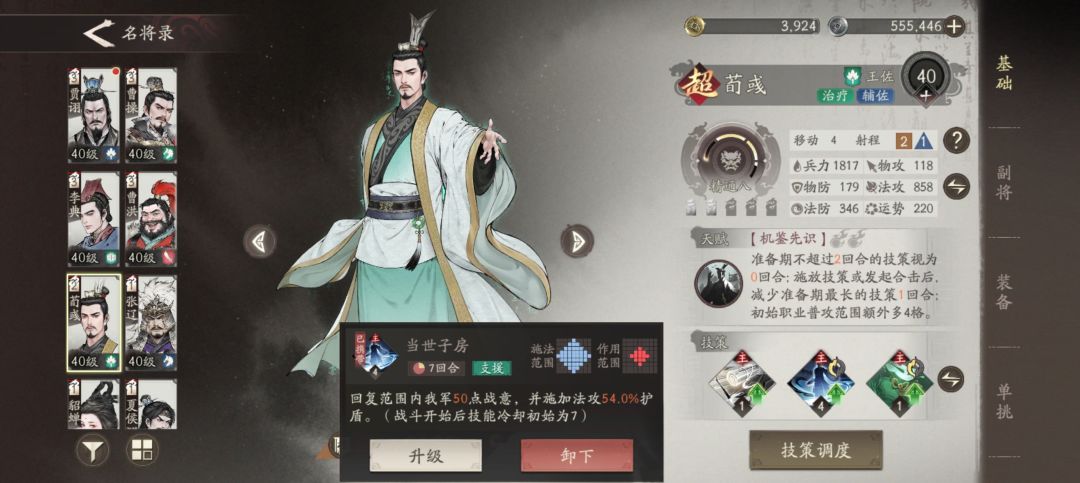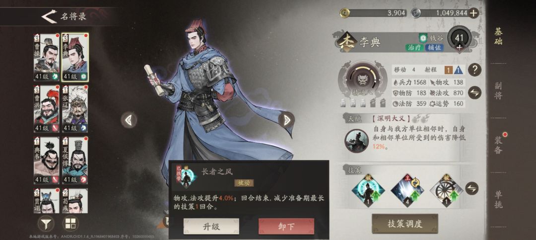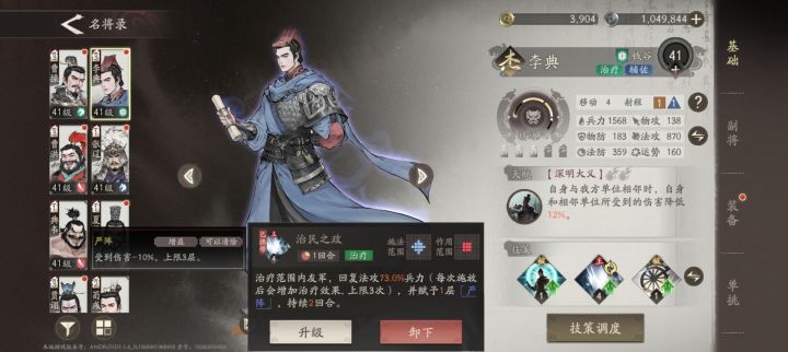 2、李典,虽然李典只是杰不是超,但是加血加减伤真的给力,尤其是被动可以减少一回合的技能冷却,等于这个加血的技能可以一直用,而且是群加,升级后奶量相当可观,我目前是可以加到八百多,而且这个技能每次释放增加治疗效果,三次后就一千多了,副将方面我是搭配了一个增加治疗效果的,一个敌方阵亡回复兵力的,保证他的续航和生存