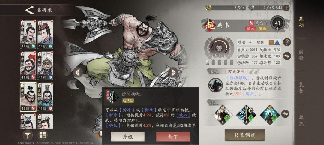 4、典韦,定位是肉盾输出,可以切换两种形态,一个是增伤攻击回血,一个是减伤分摊伤害(打吕布这种超级爆发,必带分摊),四十级后可以解锁掉血减伤给对方减全属性,研修一级就能持续到战斗结束,一层5%,一共可以叠加三层减15%,典韦天赋被反击后,可以追击目标,普攻一下(伤害只有物攻35%),因为典韦主动输出技能,所以副将给他带了普攻伤害降低但是可以攻击两次,第二次攻击伤害更高,但是具体多少数值不清楚