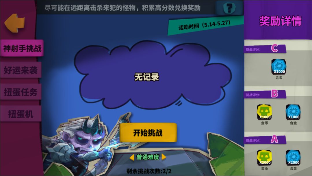 在神射手挑战中将不断出现怪物,各位参赛的骑士需要阻止怪物逃跑。当怪物逃跑数量过多,则挑战失败。击败怪物的时间越短,则得分越高。另外骑士还能在挑战开始时获得一个随机技能,可以给骑士提供一定助力。