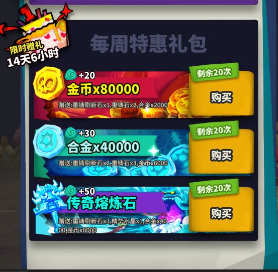 - 金币每周特惠礼包额外赠送:合金x2000,重铸石x2,重铸刷新石x1